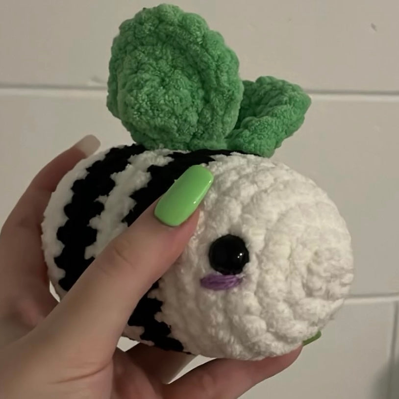 Adopt this cute crochet beetlejuice inspired bee! This product is a perfect gift for friends, family or even yourself, especially with Halloween around the corner! Have it as a desk buddy, or a cuddly toy for the youngsters!