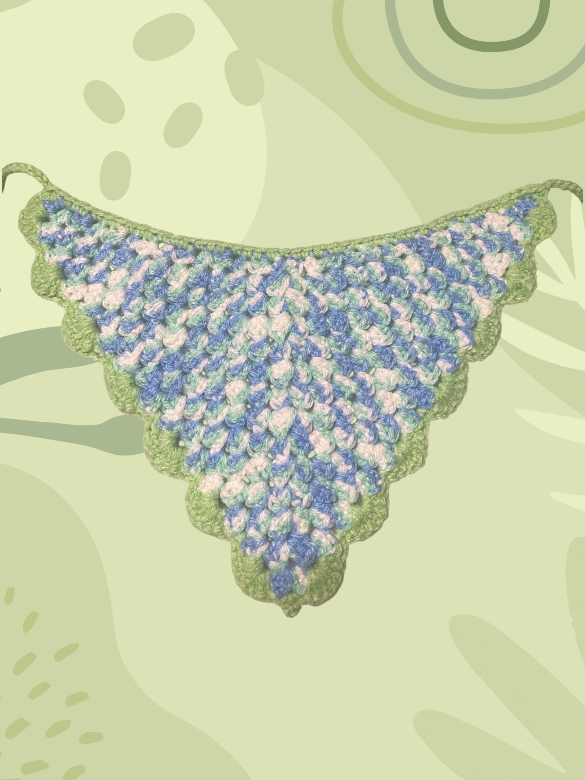 This bandana is handmade with love, using the softest acrylic yarn you could imagine. It measures to be about 16cm long and 28cm wide. The straps are each 43cm long.