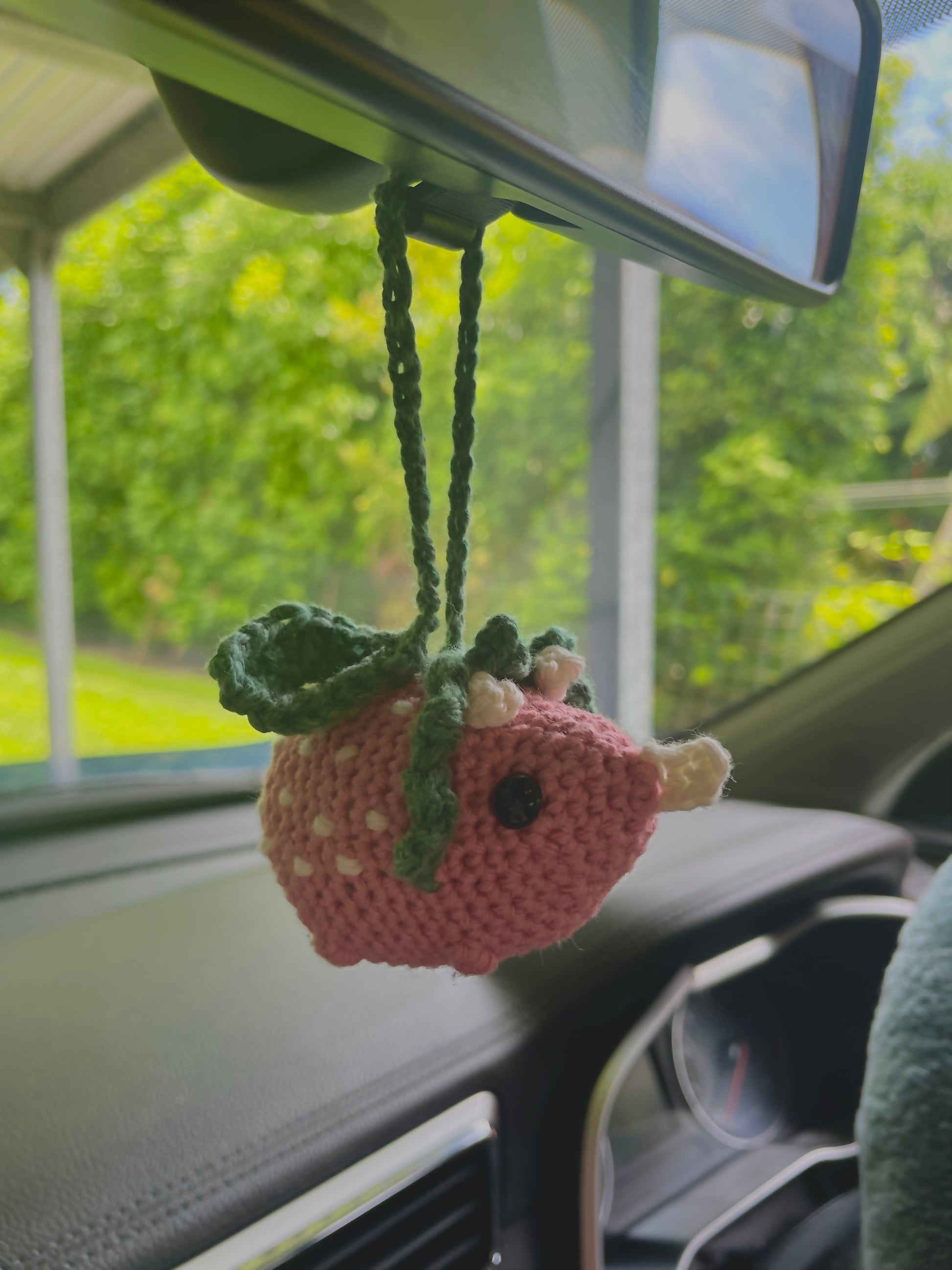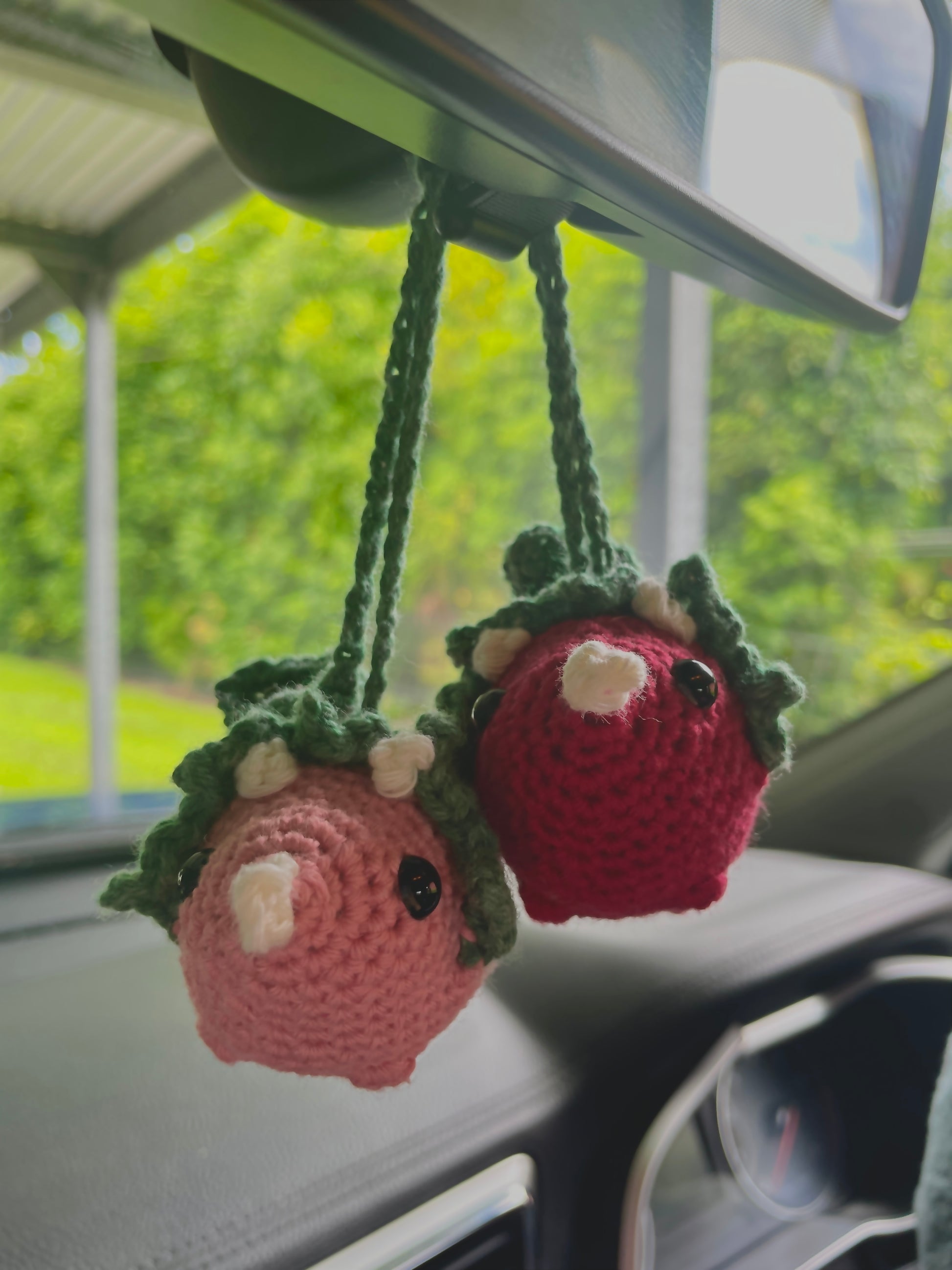 Adopt this cute crochet hanging strawberry triceratops! This product is a perfect gift for friends, family or even yourself! Have it as a cool car accessory buddy, or wonderful wall décor toy for the youngsters!