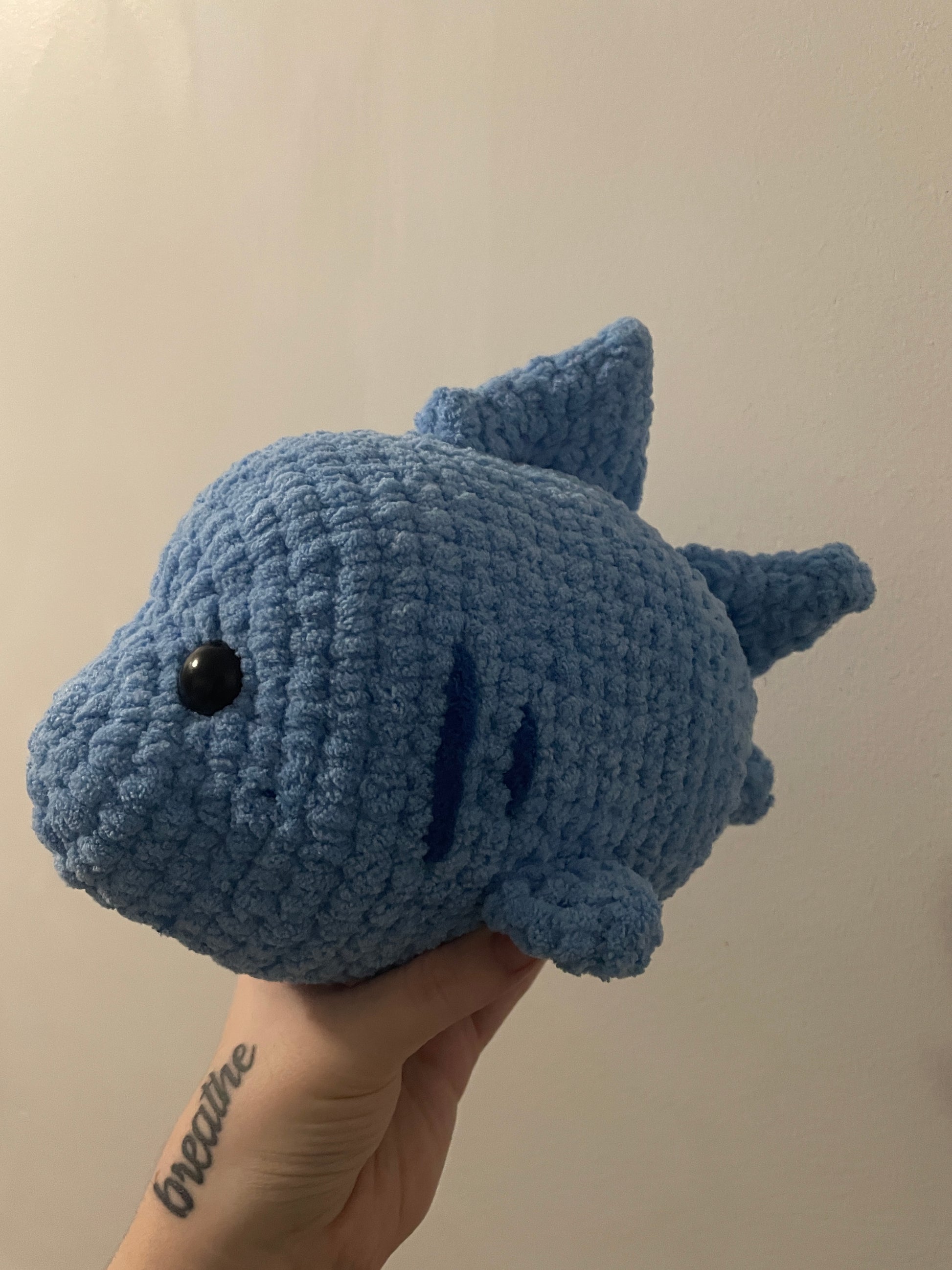 This jumbo shark is handmade with love, using the softest blanket yarn you could imagine. It measures to be about 25cm long, 17cm wide and 19cm tall.